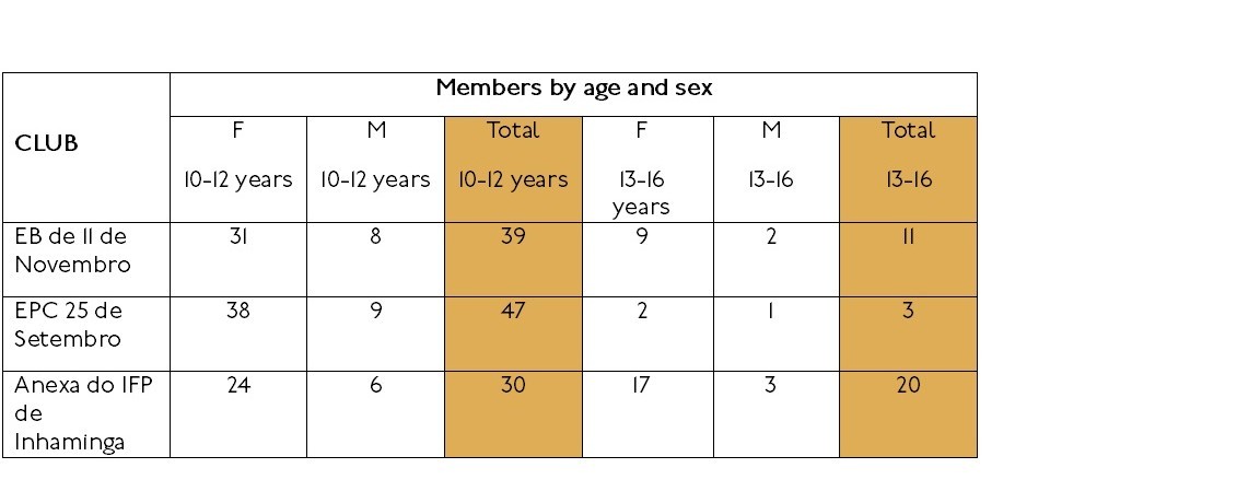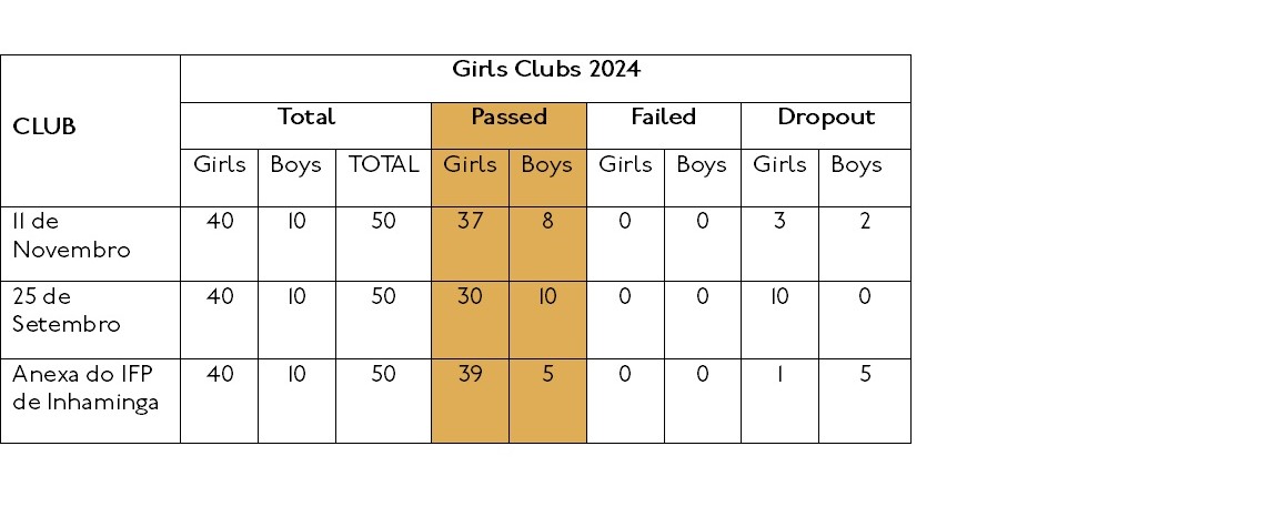 Mit den Zuwendungen der AGS konnten in Inhaminga binnen weniger Monate drei Girls Clubs an den Grundschulen "EB de 11 de Novembro", "EPC 25 de Setembro" und "EB de Inhaminga" aufgebaut werden. Alle drei Schulen haben einen hohen Mädchenanteil, von denen leider noch zu viele die Schule abbrechen. In Mosambik werden Kinder oft erst ab dem Alter von neun oder zehn Jahren eingeschult, es gibt sechs Klassenstufen.